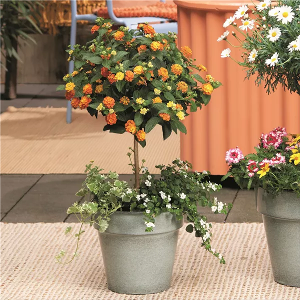 Kaum eine Sommerpflanze spielt so virtuos mit Farbe wie das WANDELRöSCHEN (Lantana camara). Seine Blüten erscheinen in dichten Dolden und verändern im Laufe der Zeit ihren Farbton – von Gelb über Orange bis hin zu kräftigem Rot oder Pink. So entsteht ein lebendiger Farbverlauf, der sowohl Stämmchen als auch Büsche immer wieder neu wirken lässt. Je nach Wuchsform setzt das Wandelröschen klare Akzente: als Busch flächig und üppig, als Hochstamm mit strukturierender Wirkung in Pflanzungen auf Terrasse oder Balkon. Das Wandelröschen liebt helle Standorte und kommt sowohl mit Sonne als auch mit Halbschatten gut zurecht. Wichtig ist eine gleichmäßige Wasserversorgung ohne Staunässe sowie ein nährstoffreiches Substrat. Regelmäßiges Ausputzen fördert die Bildung neuer Blüten und hält das charakteristische Farbspiel den ganzen Sommer über in Bewegung.