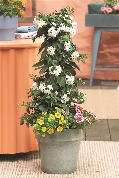 Die SOMMERJASMIN-PYRAMIDE (Solanum jasminoides) begleitet den Sommer über viele Monate hinweg. Bereits im Frühsommer öffnen sich die ersten sternförmigen Blüten, die sich bei guten Bedingungen bis in den Herbst zeigen. Diese lange Blütezeit macht die Pyramide zu einem verlässlichen Gestaltungselement, das Arrangements über die gesamte Saison frisch und lebendig hält. Voraussetzung dafür sind ein heller Standort sowie eine gleichmäßige Versorgung mit Wasser und Nährstoffen, Staunässe sollte vermieden werden.
