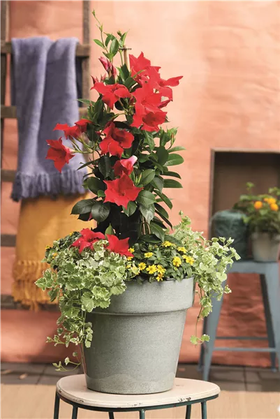 Glänzendes, dunkelgrünes Laub und große, trompetenförmige Blüten verleihen der DIPLADENIEN-PYRAMIDE (Dipladenia-Hybride) ihren unvergleichlichen Charakter. Die Blüten erscheinen in Rot, Pink oder Weiß und behalten ihre Leuchtkraft auch bei hohen Temperaturen. An warmen, geschützten Plätzen setzt die Dipladenie ein exotisches State-ment. Sie ist hitzeverträglich, kommt mit wenig Wasser aus, benötigt lediglich einen hellen Standort und regelmäßige Nährstoffgaben.