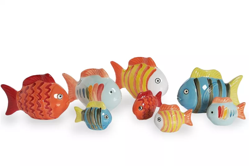 Die SCHWIMM-FISCHE aus Porzellan bringen mit leuchtenden Farben und verspielten Mustern Bewegung in Mini-Wasseroasen oder Schalen. Ob gestreift, in Türkis, Koralle oder Sonnengelb – jeder wirkt wie ein kleines Unikat. Besonders in flachen Wasserschalen reflektiert die glasierte Oberfläche das Licht und unterstreicht das sommerliche Flair.