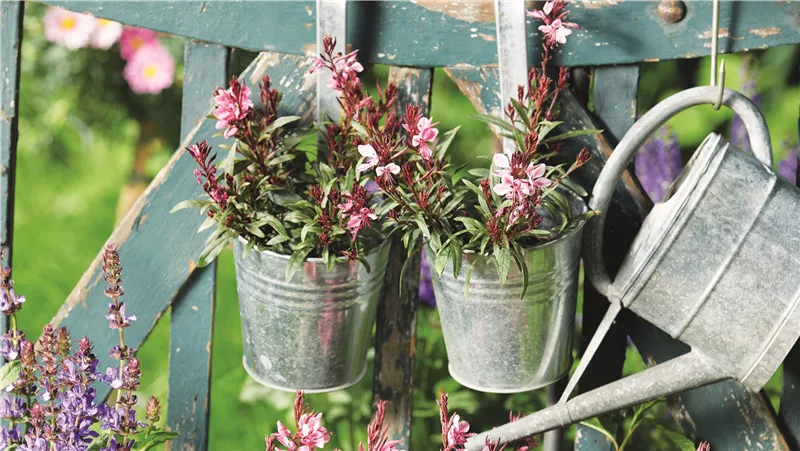 Locker, fast schwebend wirkt die PRACHTKERZE (Gaura lindheimeri), wenn ihre zarten Blüten über den Blättern tanzen. An langen, feinen Trieben öffnen sich unzählige weiß- oder rosafarbene Einzelblüten. Jede nur für kurze Zeit, doch ständig folgen neue. So entsteht über viele Wochen ein Eindruck von Bewegung. Ursprünglich stammt sie aus den Prärien Nordamerikas. Diese Herkunft erklärt ihre Vorliebe für warme, sonnige Plätze und durchlässige Böden. Mit Trockenphasen kommt sie gut zurecht, auf dauerhaft nasse Erde reagiert sie empfindlich.
