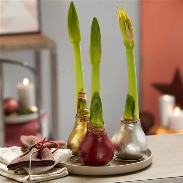 Verschenken Sie doch einmal den neuen Pflanzentrend an Weihnachten: eine Amaryllis, deren Zwiebel in z.B. rot-, gold-, oder silberfarbenes Wachs getaucht wurde. Ohne großen Pflegeaufwand treibt die Pflanze bereits nach kürzester Zeit aus.