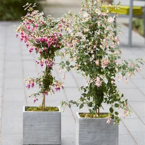 In halb- und wechselschattigen Ecken und Nischen sind dazu speziell Funkien gut geeignet. Sie gedeihen in Kübeln prächtig und die Vielfalt ihrer Blattformen, Blattausfärbungen und vor allem auch Wuchshöhen lassen für praktisch jede Verwendung die passende Wahl zu. Beliebte Dauerblüher für die weniger sonnigen Plätze sind Fuchsienstämmchen und –säulen, die sich später einmal leicht überwintern lassen und die jedes Jahr an Schönheit noch zunehmen.