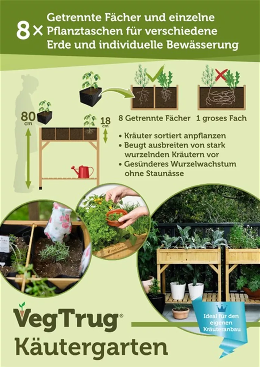 Getrennte Fächer ermöglichen jedem Kraut sein eigenes Beet und das auf kleinstem Raum. So kann jedes Fach mit der passenden Erde befüllt werden und jedes Kraut kann individuell nach Bedarf gegossen werden. Hier ist eine Bepflanzung ganz nach dem eigenen Geschmack möglich, denn die Kräuternachbarn können hier die unterschiedlichsten Ansprüche haben, selbst Starkwurzler können nicht auf den Wurzelbereich der übrigen Pflanzen übergreifen. Die VegTrug-Konstruktion fördert ein gesünderes Wurzwelwachstum ohne Staunässe.