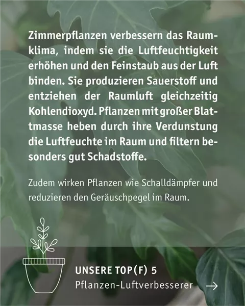 WEITERE INFOS: Bis zu 97% des Gießwassers gibt zum Beispiel das Zyperngras (Cyperus alternifolius) an die Umgebung zurück. Immer durstig ist die Goldfruchtpalme (Chrysalidocarpus lutescens). Viel Wasser braucht auch die Zimmerlinde (Sparmannia africana), welches sie luftverbessernd über ihre behaarten Blätter verdunstet. Die Pflanzen schmücken Büros und Wintergärten. Wasserverdunstung ist ein biologischer Vorgang, den die großen Blätter der exotischen Dieffenbachia aus dem Regenwald perfekt beherrschen. Die schöne Pflanze wirkt auch gegen Formaldehyd. Fast jede Pflanze ist deshalb ein Plus, doch einige von ihnen können auch Schadstoffe zerlegen. Wunderwirkungen darf man zwar nicht erwarten, doch immerhin schafft es eine größere Birkenfeige (Ficus benjamina), täglich den Nikotin-Qualm von 2 Zigaretten in einem 4 x 2 Meter-Zimmer abzubauen. Für Raucherzimmer ist die bekannte Pflanze deshalb ideal und noch dazu leicht zu pflegen. Nicht alle genannten Sorten sind dauerhaft im Gartencenter erhältlich. Wir helfen gerne bei der Auswahl.