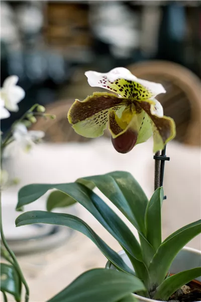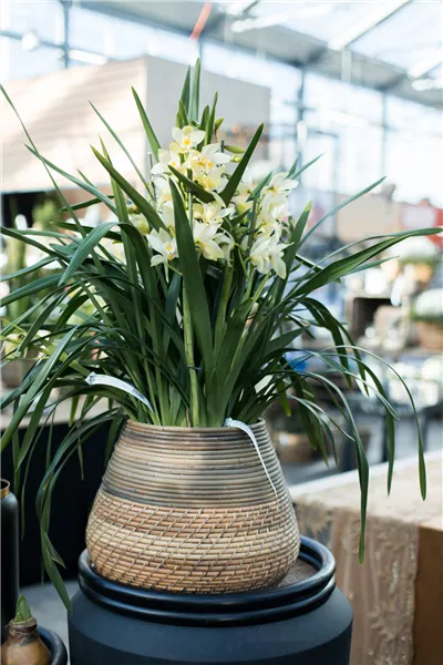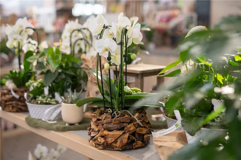 Die Phalaenopsis ist wohl eine der bekanntesten und beliebtesten Orchideen. In ihrer Heimat, dem tropischen/subtropischen Asien, leben Phalaenopsis mit Hilfe ihrer vielen Luftwurzeln auf anderen Pflanzen und beziehen ihre Nährstoffe aus der Luft. Bei uns wachsen Malaienblumen am besten in einem luftigen Substrat im Topf in hellen Räumen, wobei sie einen Standort ohne direkte Sonneneinstrahlung bevorzugen. Eine einmalige Wassergabe pro Woche sollte je nach Standort und Jahreszeit ausreichend sein. Staunässe ist unbedingt zu vermeiden. Mit mehr als 70 verschiedenen Sorten in allen möglichen Farbvariationen wird die Phalaenopsis auch gerne zum Bepflanzen von Schalen genommen.